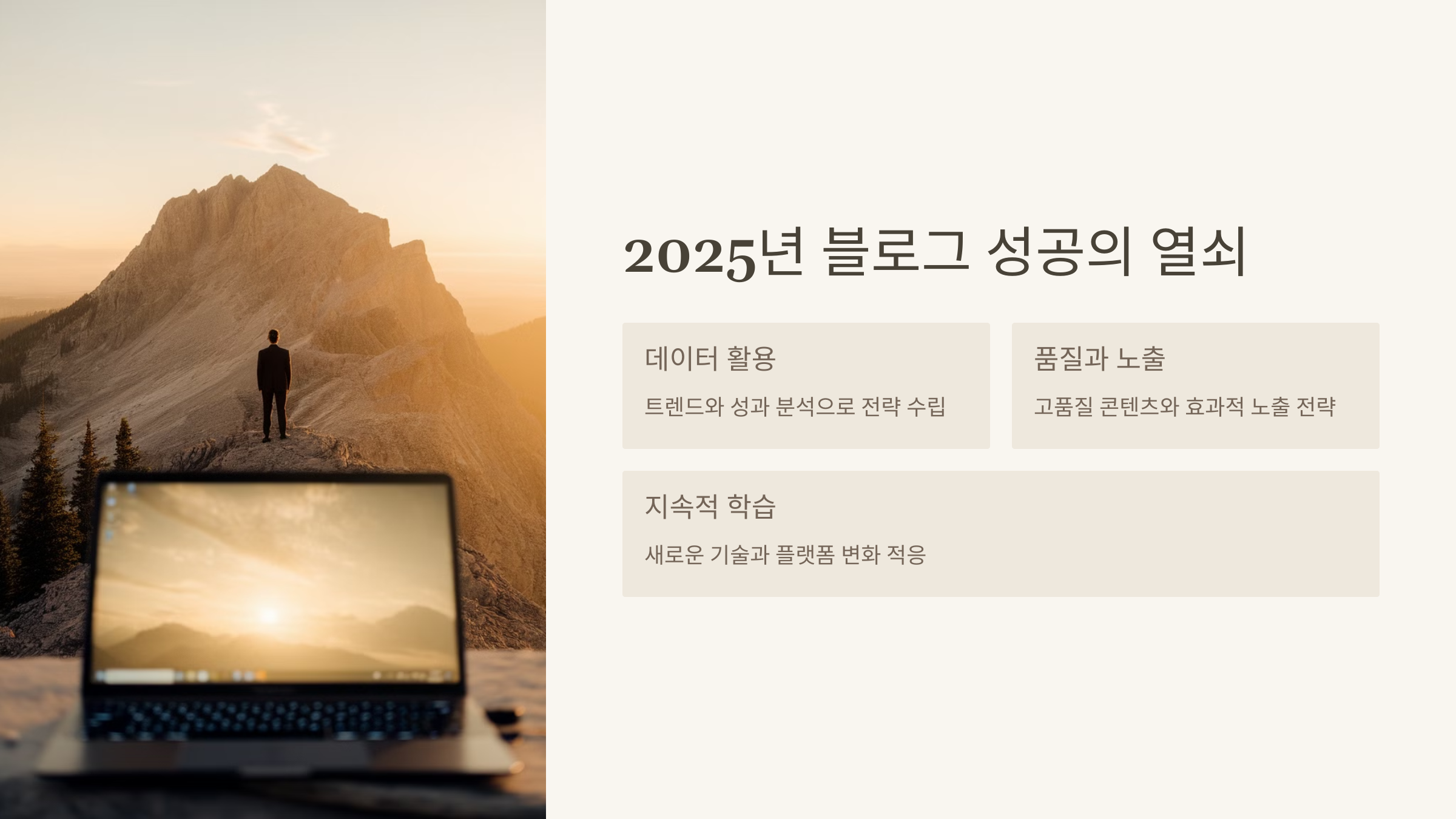 2025년은 단순히 글을 잘 쓰는 것에서 벗어나, 노출 전략과 외부 트래픽 활용이 더 중요한 시대입니다. 실력을 기반으로 꾸준히 노력하면서도, 새로운 기술과 데이터를 적극 활용하는 것이 성공의 열쇠입니다.