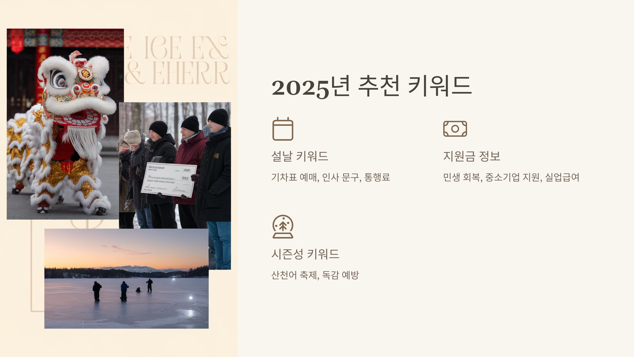 - 예를 들어, "2025 설날 기차표 예매 일정"처럼 행동을 유도하는 키워드를 활용하면 더 높은 효과를 기대할 수 있습니다.