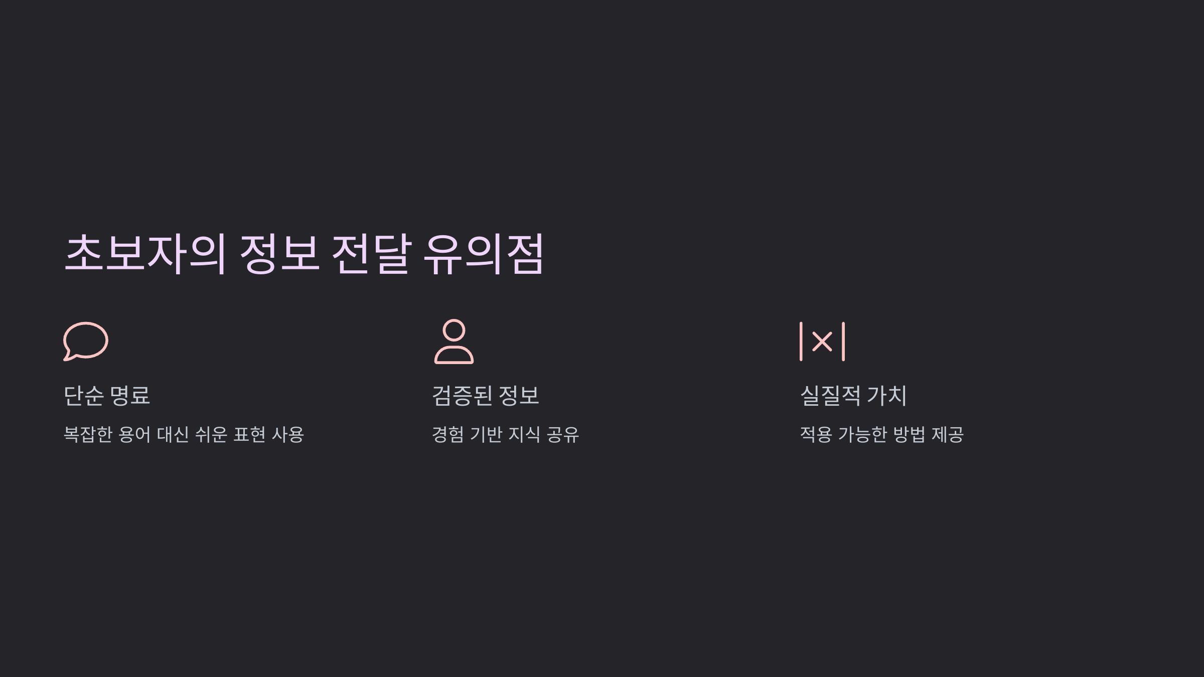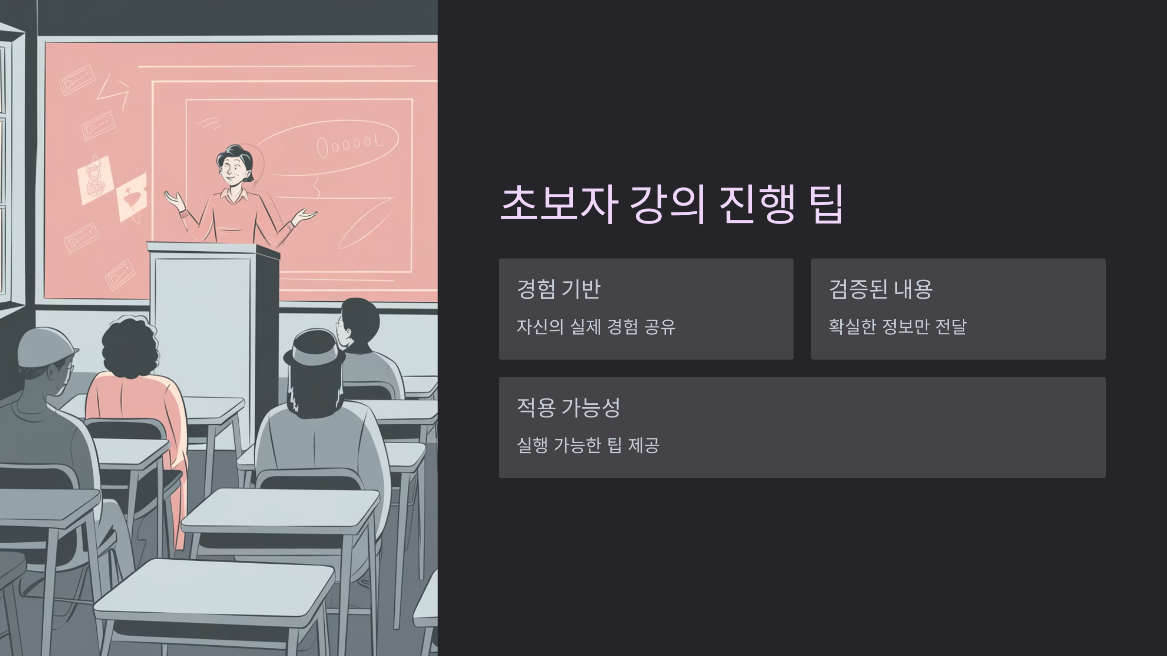 - 단순히 정보를 나열하는 것이 아니라, 강의를 듣는 사람이 실제로 적용할 수 있는 방법을 제공해야 합니다.