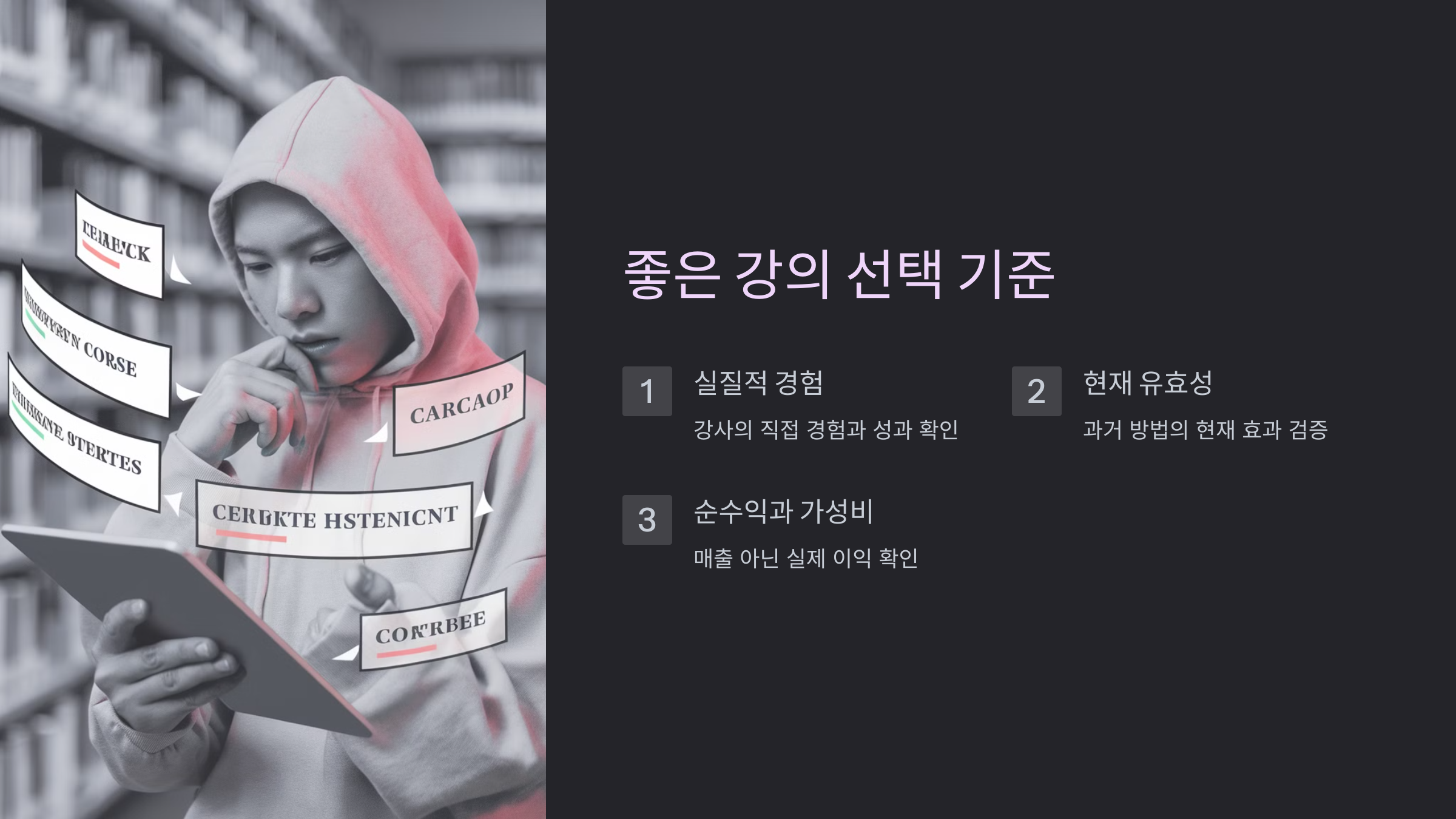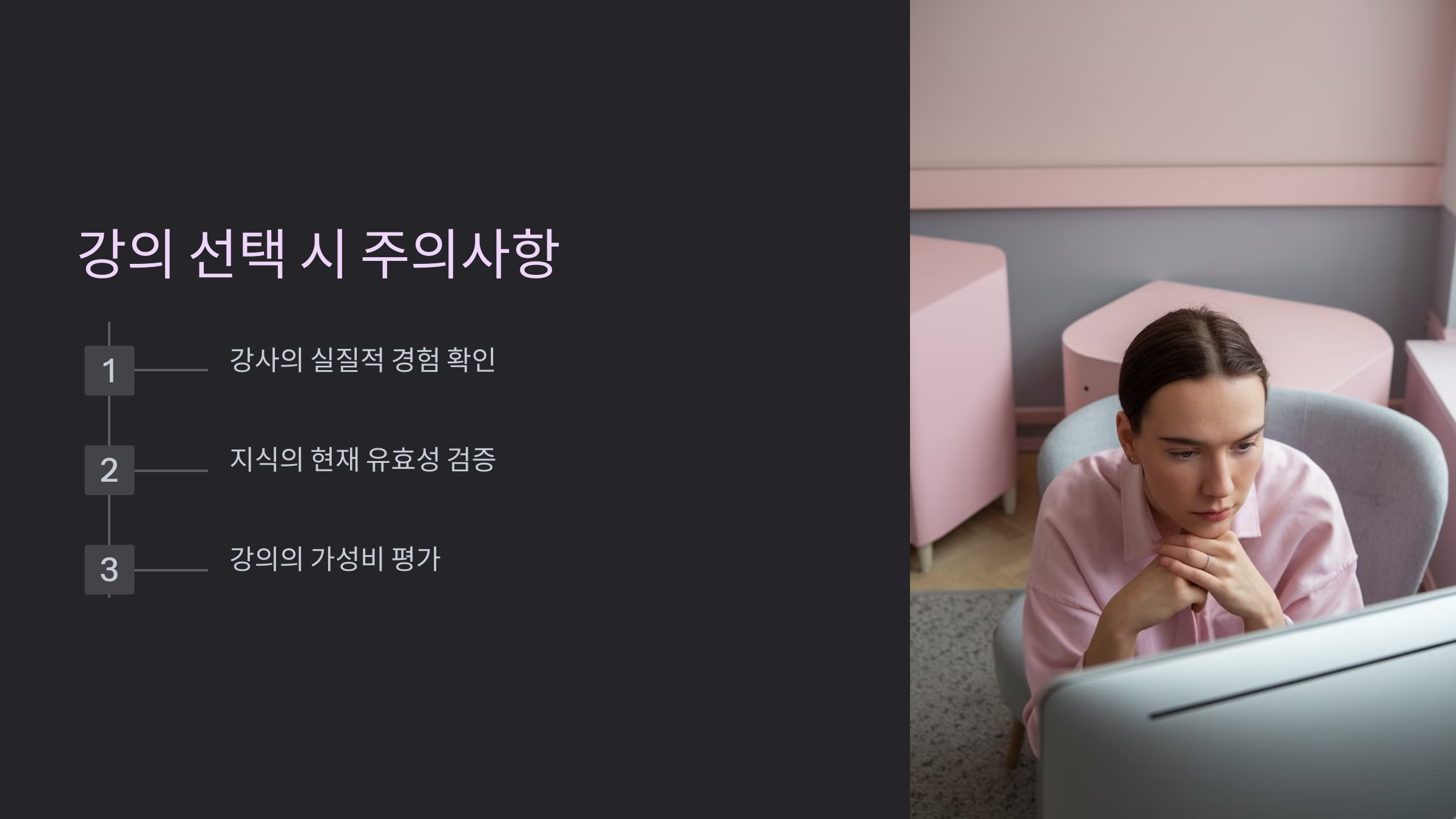 A3: 강사가 공유하는 정보가 실질적으로 적용 가능한지, 그리고 해당 강의가 가성비가 좋은지 평가하세요.