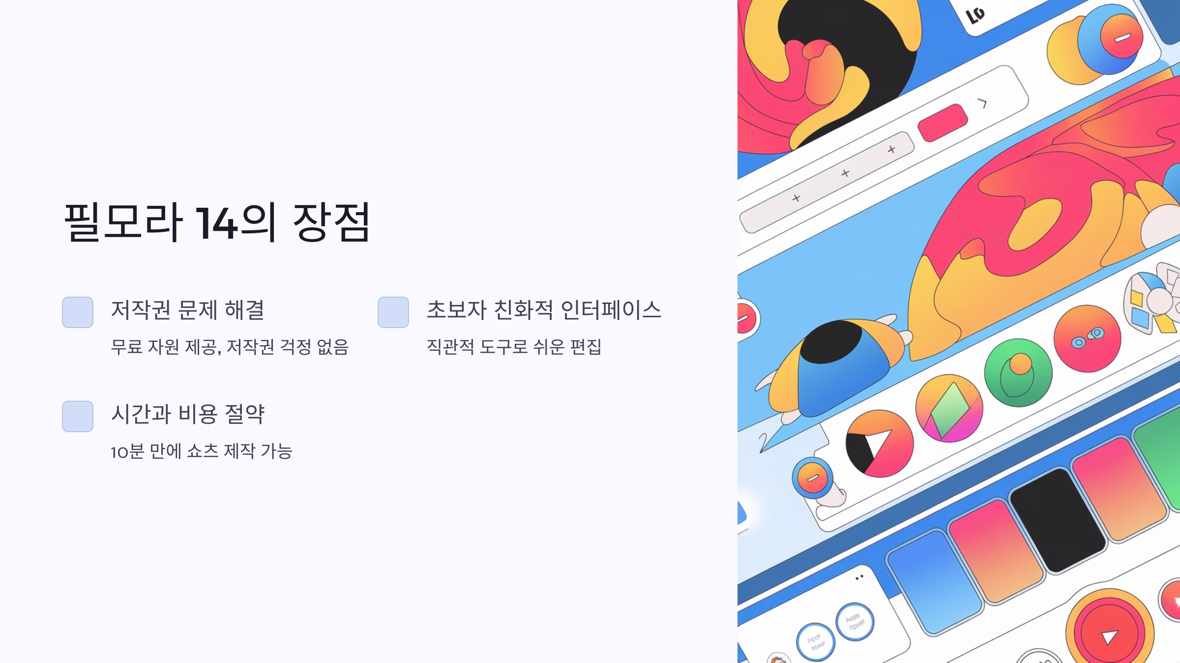 - 필모라는 영상 제작에 필요한 자원을 무료로 제공하며, 저작권 걱정 없이 사용 가능합니다.