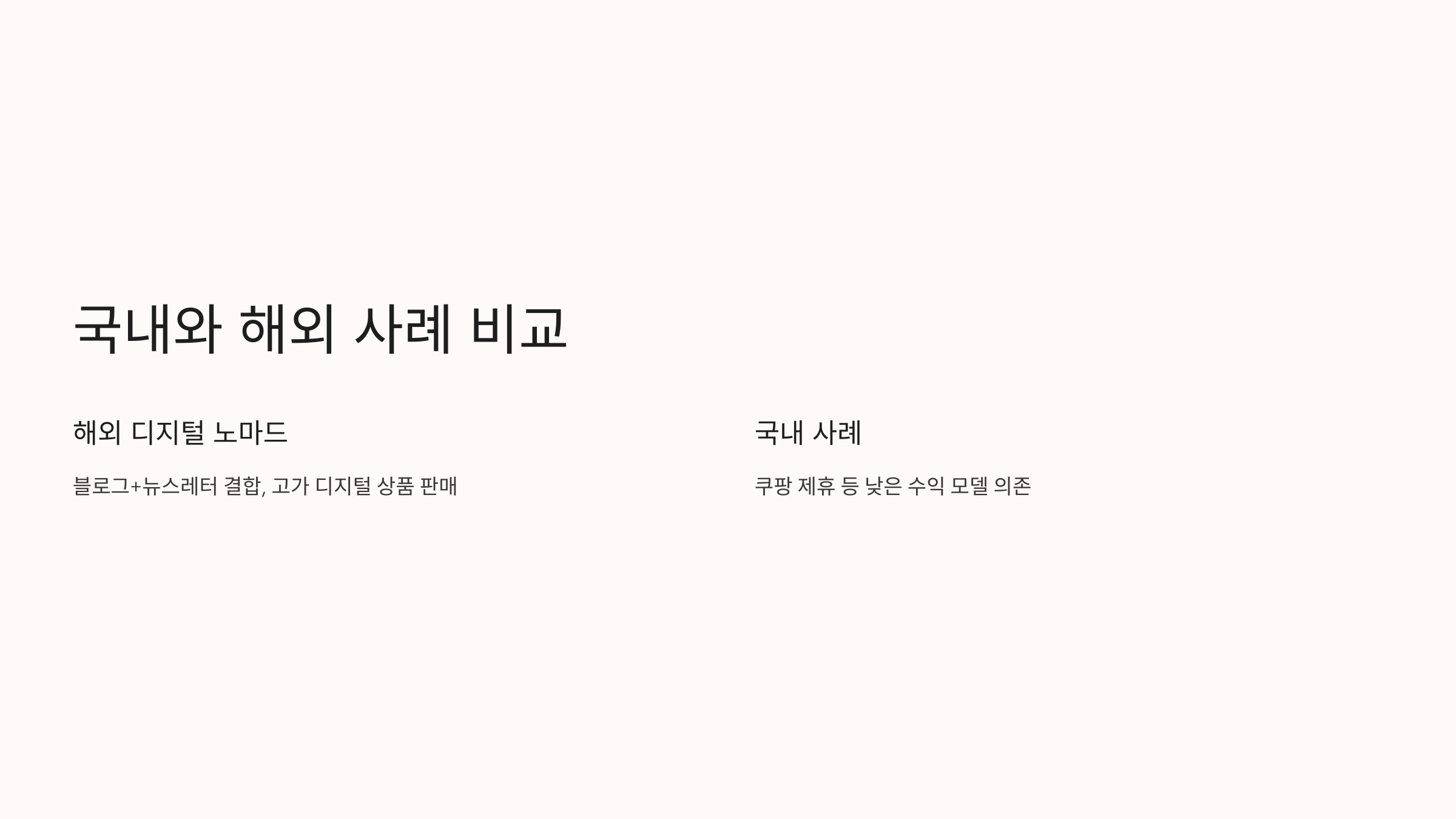 - 국내는 주로 쿠팡 제휴와 같은 낮은 수익 모델에 의존.